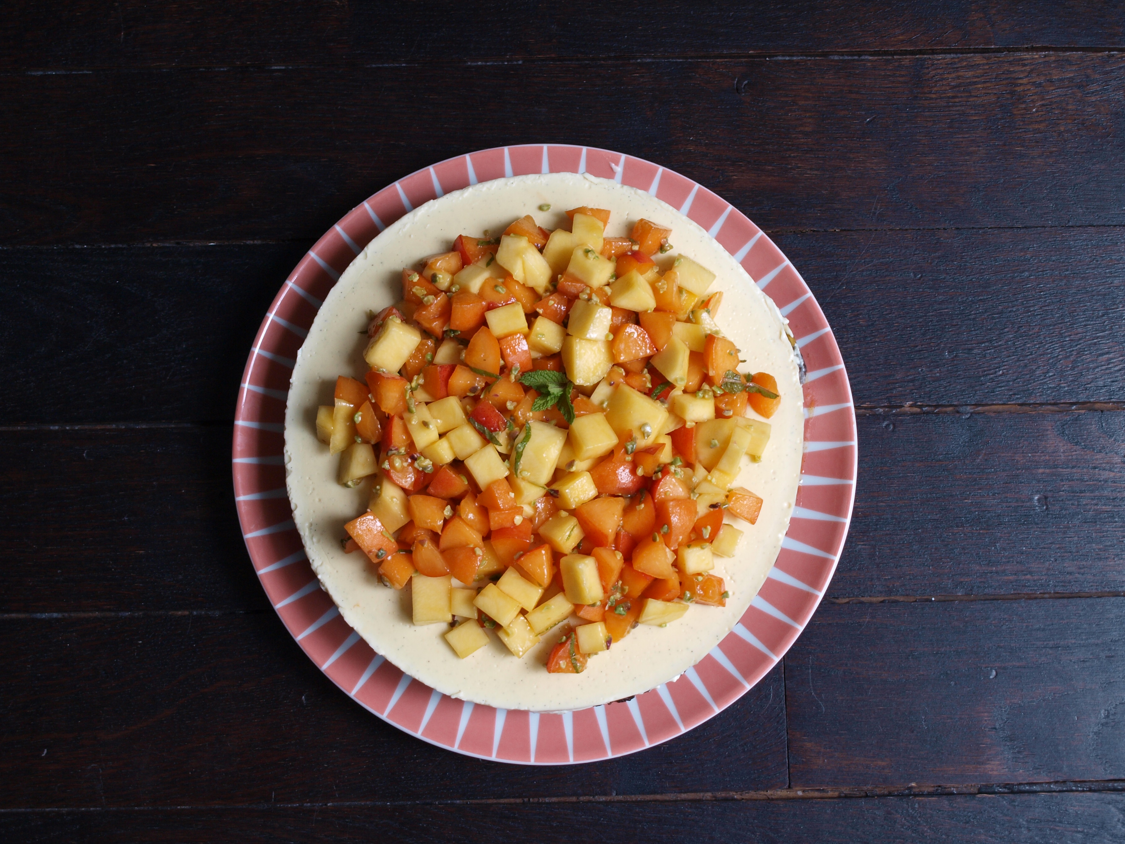 Dans le fond de tarte déposer la compoté. Decercler la pana cotta et la déposer sur le dessus de la tarte. Décorer avec des fruits frais (ici abricots et mangues).